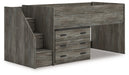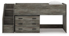 Cool, casual style is for all ages. With this twin loft bed with drawer storage, they get the function they need plus the refined design you love. Approachably neutral in a rustic warm gray, it’s adaptable enough to pair with an assortment of existing colors and room decor. Faux metal detailing with nailhead accents lends an industrial edge. And with its space-saving lofted design and included drawers, this bed doubles as a storage solution for clothes, toys and everything in between.