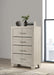 This four-drawer chest offers a stylish combination of rustic charm and modern design, making it a perfect storage solution for contemporary bedrooms. Finished in a rustic cream with rough-sawn, white-washed engineered paper veneer, it has a warm, textured appeal that’s both inviting and chic. The extra-wide polished nickel handles add a sleek, modern touch, creating a subtle contrast. Built with engineered wood, the chest features English dovetail joinery and Center metal glides for durability and smooth functionality, ensuring it meets both aesthetic and practical needs.